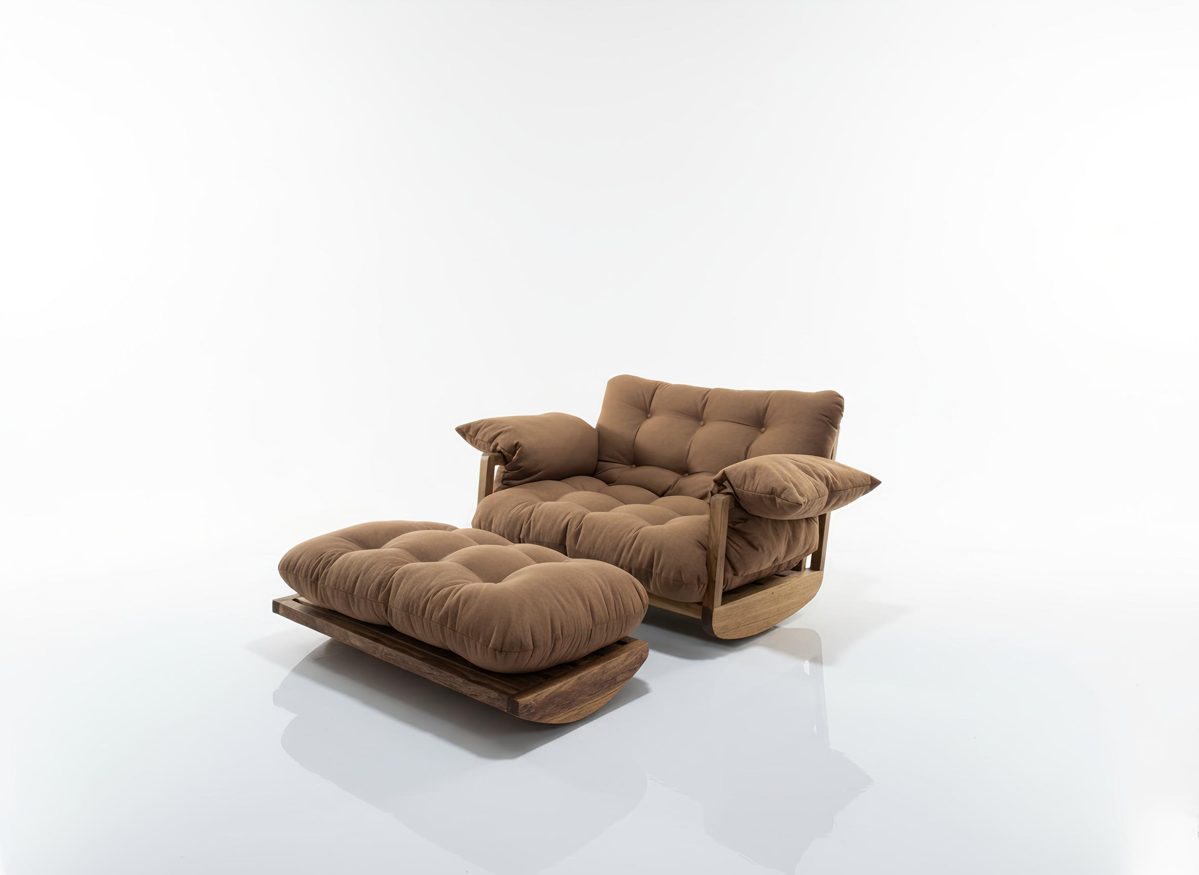 Laziness is a laid-back and spacious rocking armchair, crafted for sitting/lying down and unwinding. The low seat height from the ground draws inspiration from Japanese rocking chairs, while the wooden structure is strongly influenced by Brazilian modernist furniture. Its upholstery is soft and cozy, and can be covered in fabric or leather.